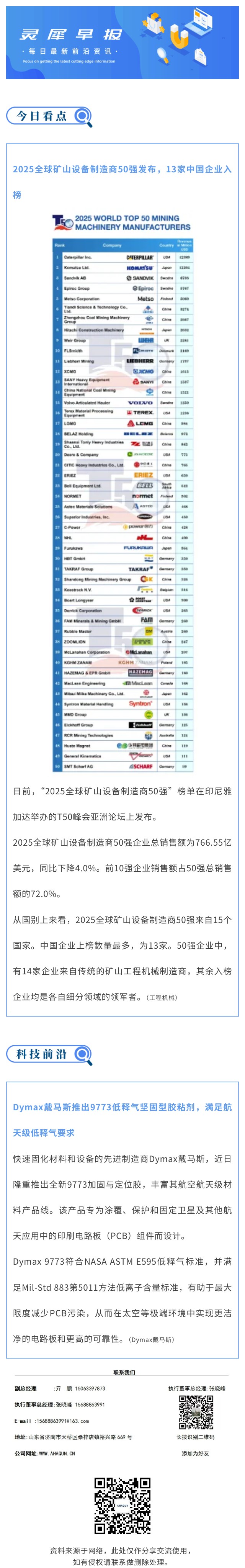 每日早报 | 2025全球矿山设备制造商50强发布,13家中国企业入榜